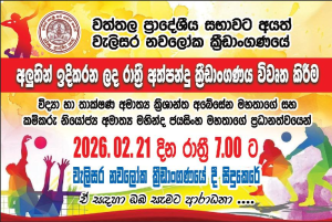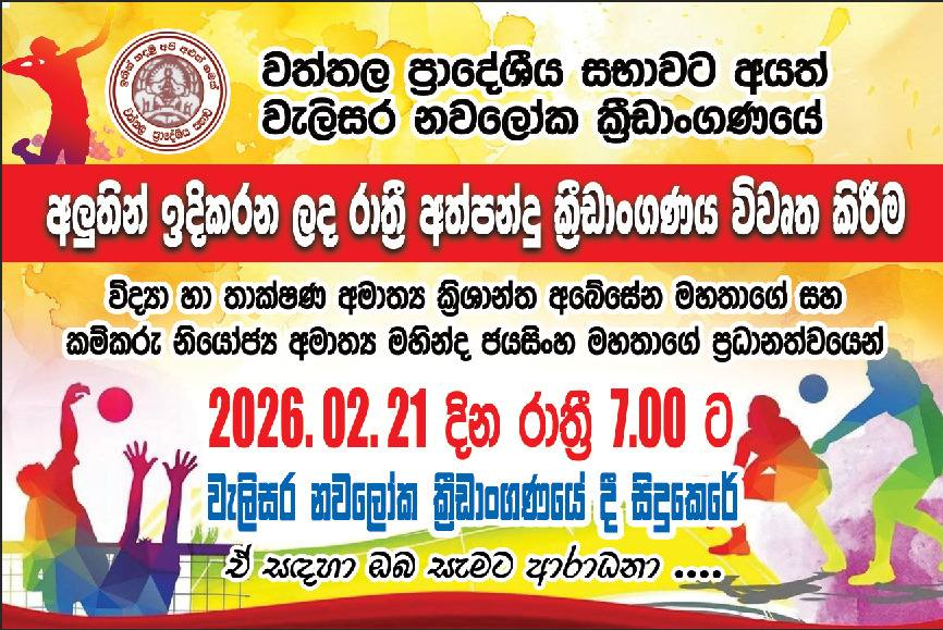වැලිසර නවලෝක ක්රීඩාංගනයේ අභිනවයෙන් ඉදිකරන ලද දිවා රාත්රී වොලිබෝල් ක්රීඩා පිටිය විවෘත කිරීම වැලිසර නවලෝක ක්රීඩාංගනයේ අභිනවයෙන් ඉදිකරන ලද දිවා රාත්රී වොලිබෝල් ක්රීඩා පිටිය විවෘත කිරීම. ,වත්තල ප්රාදේශීය සභාවේ සභාපති බ්රිහාන් ආබ්ඩීන් මහතාගේ ආරාධනයෙන් විද්යා හා තාක්ෂණ අමාත්ය ක්රිෂාන්ත අබේසේන මැතිතුමාගේ හා කම්කරු නියෝජ්ය අමාත්ය මහින්ද ජයසිංහ මැතිතුමාගේ ප්රධානත්වයෙන් සිදු විය